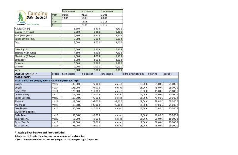 €21 per night (includes 1 pitch with 6 AMP electricity, 2 adults, and 1 dog or pet)